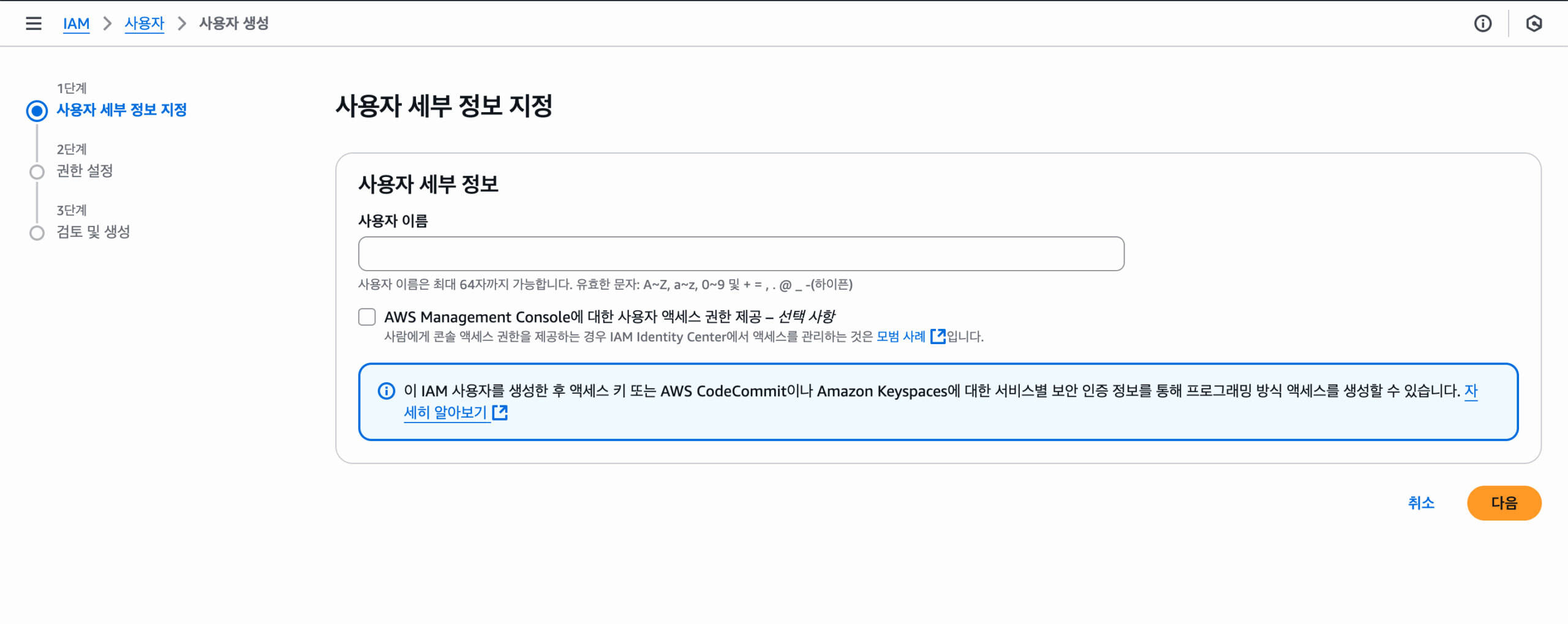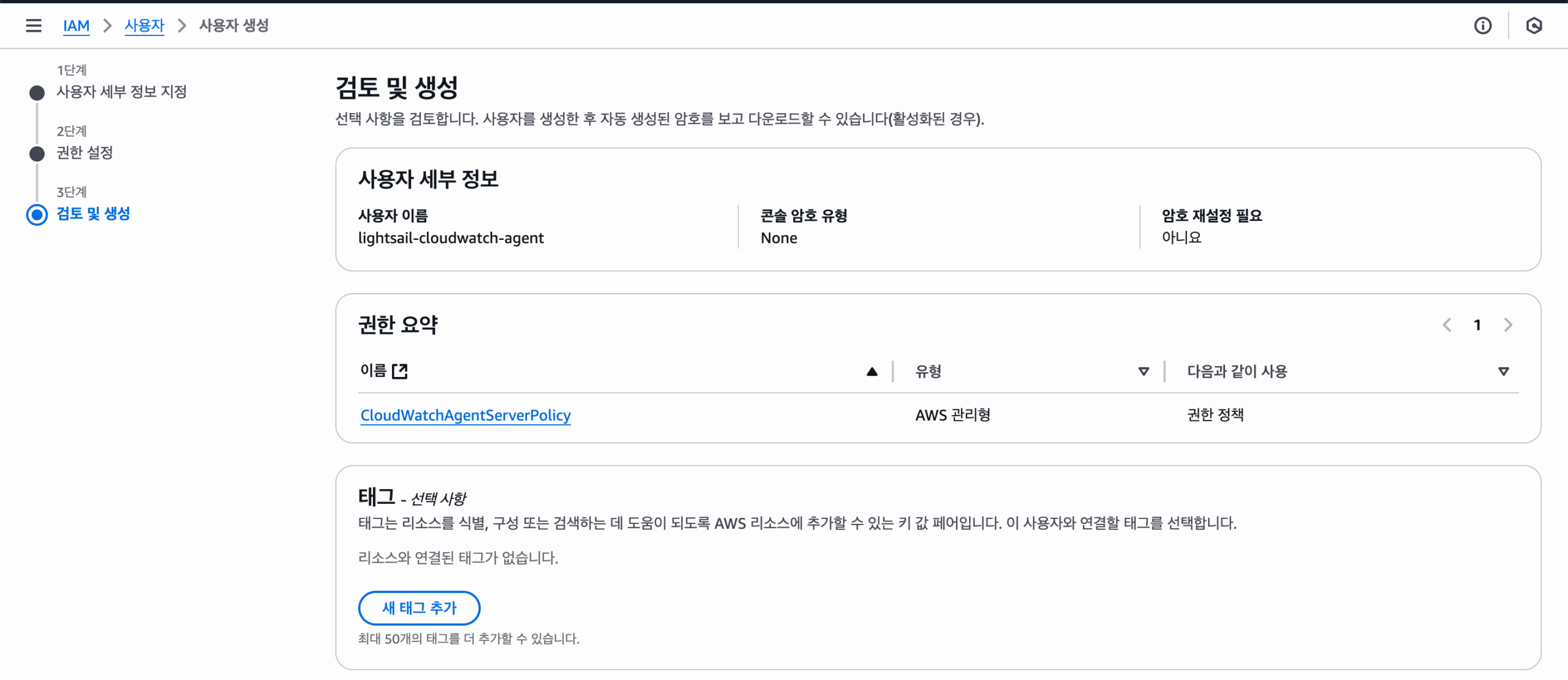 IAM -> 사용자 -> 사용자 생성 을 눌러, 사용자 이름을 입력합시다. 저는 lightsail-cloudwatch-agent