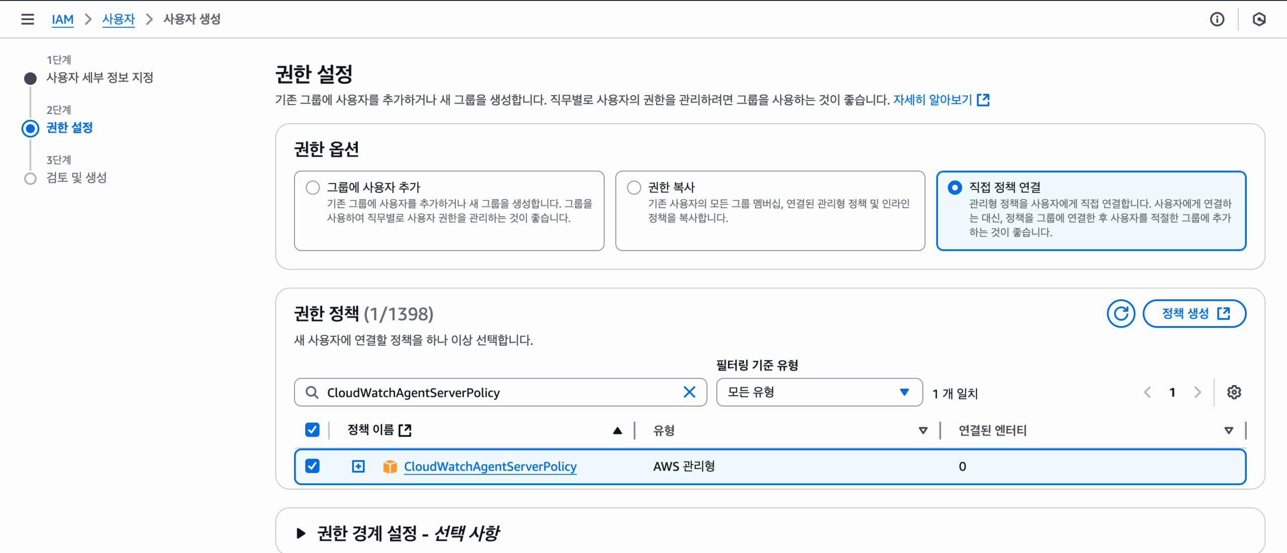 다음 버튼을 누르고, “직접 정책 연결 -> CloudWatchAgentServerPolicy 검색 -> 체크박스 클릭” 을 수행합니다.