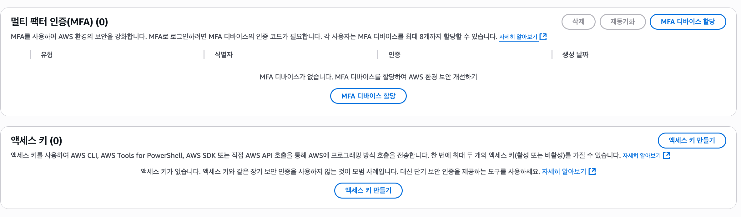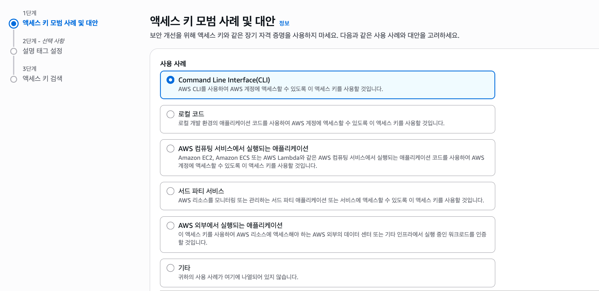 를 선택하시고, 액세스 키와 시크릿 쌍을 저장해주세요!