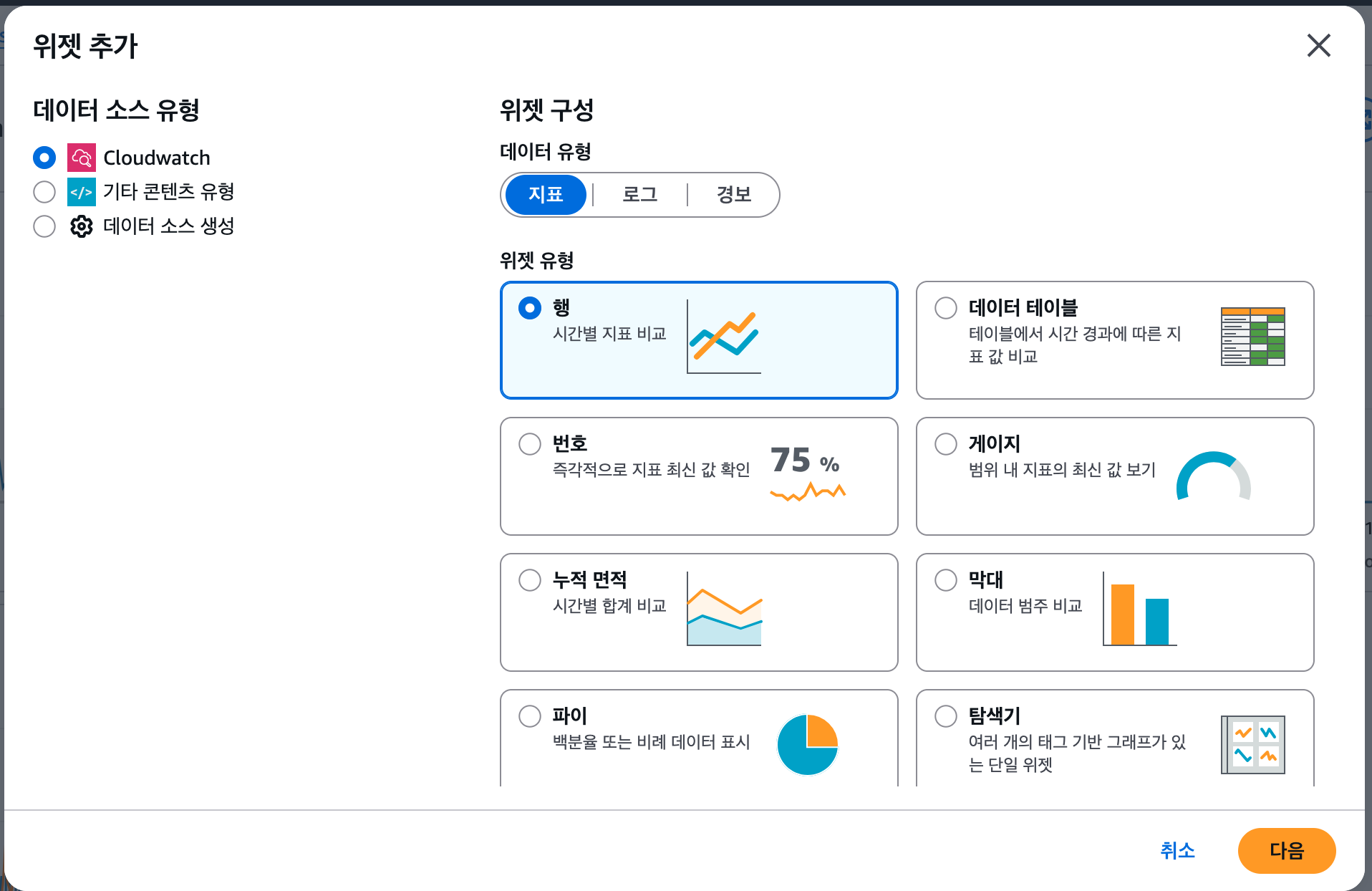 에서 대시보드를 생성하고 위젯을 아래와 같이 추가할 수 있습니다.